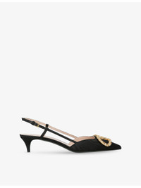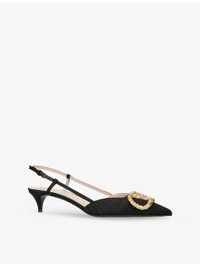 PRODUCT DETAILS - Valentino Garavani leather slingback courts - 100% satin - Ankle-buckle fastening - Closed toe, pointed toe, logo plaque at front with rhinestone embellishment, kitten heel, slingback design, gold-tone hardware - Heel height 40mm / 1.5in - Wipe with a clean, dry cloth - Made in Italy - Upper: 100% satin - Lining: 100% leather - Sole: 100% leather - Presented in a box, comes with a dust bag Ref: R04453414