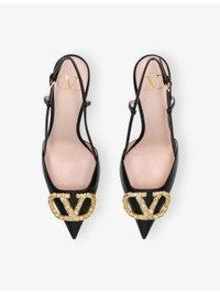 PRODUCT DETAILS - Valentino Garavani leather slingback courts - 100% leather - Adjustable buckle fastening - Closed pointed toe, crystal and faux-pearl embellished Vlogo brand hardware at front strap, gold-toned hardware, slingback strap, stiletto heel - Heel height 3.1” - Specialist leather clean - Made in Italy - Upper: 100% leather - Lining: 100% leather - Sole: 100% leather Ref: R04473816