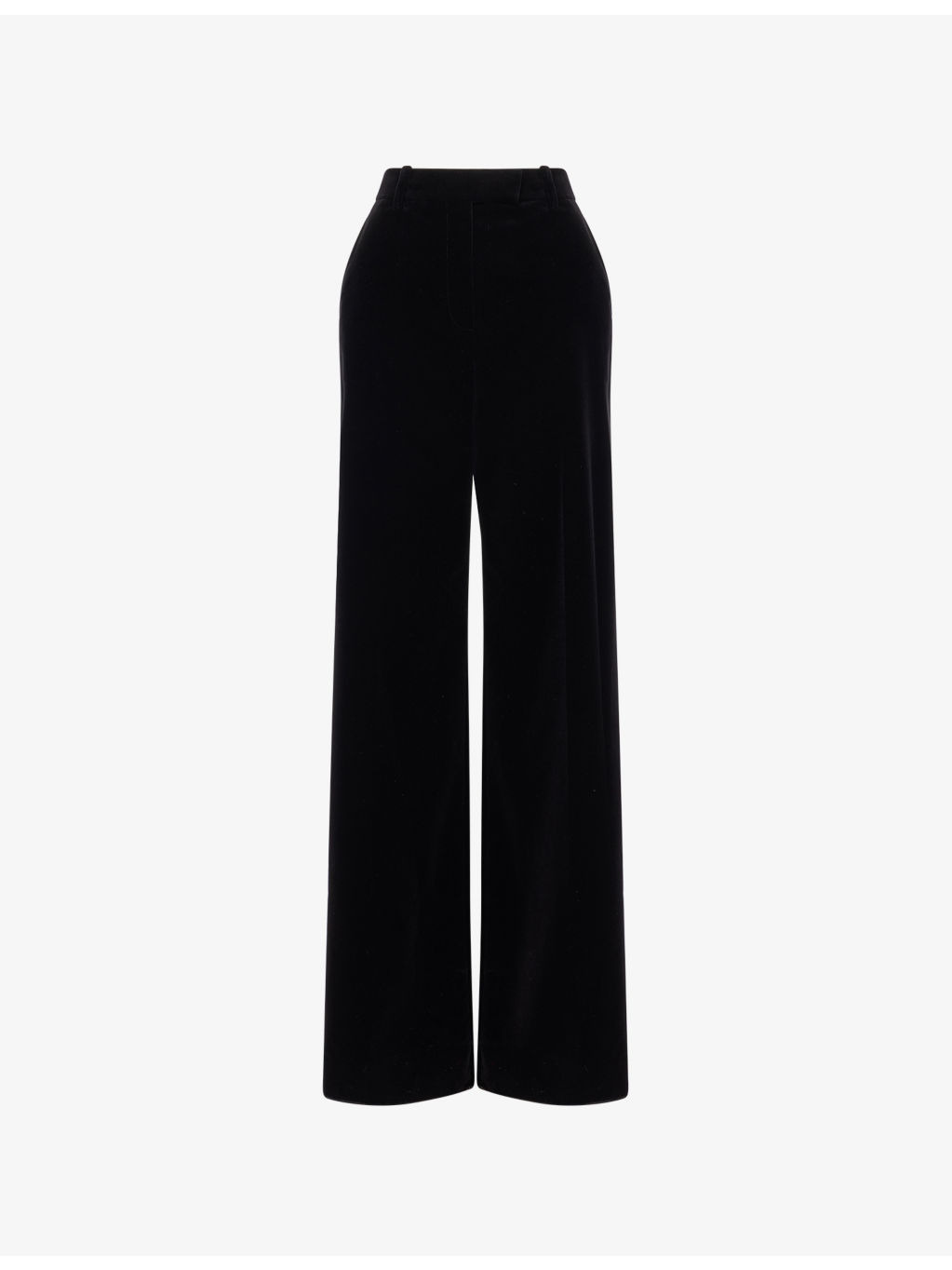 PRODUCT DETAILS - Valentino Garavani velvet trousers - 100% cotton; pocketlining 100% cotton - Concealed hook-and-eye and zip-fly fastening at front - Regular fit, high-rise, wide leg, structured waistband with belt loops, two side slip pockets, pressed creases at leg, two rear welt pockets, velvet texture - Specialist dry clean only - Made in Italy - True to size - Size UK 8: rise 12in / 30.5cm, inside leg 36in / 91.5cm, leg opening 18in / 47cm - Model is 5ft 10in/1.78m and wears a size UK 8 - Midweight, non-stretch Ref: R04505636