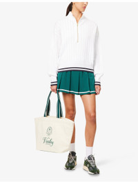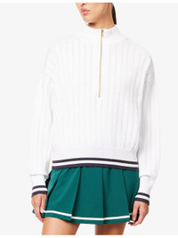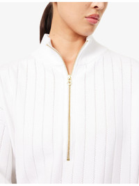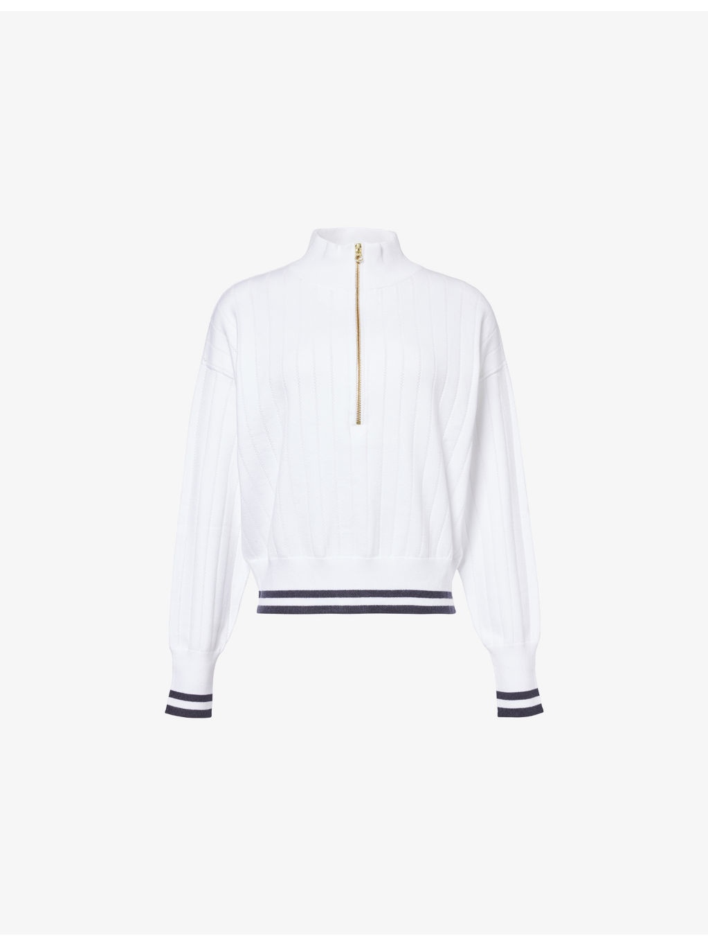PRODUCT DETAILS - Varley knitted jumper - 50% viscose, 30% polyester, 20% nylon - Exposed zip fastening at front - Relaxed fit, high-neck, long sleeves, all-over pointelle embellishment, all-over knitted, ribbed striped trims - Machine wash at 30°C - True to size - Model is 5ft 10in/1.78m and wears a size small - Midweight, stretchy Ref: R04450104