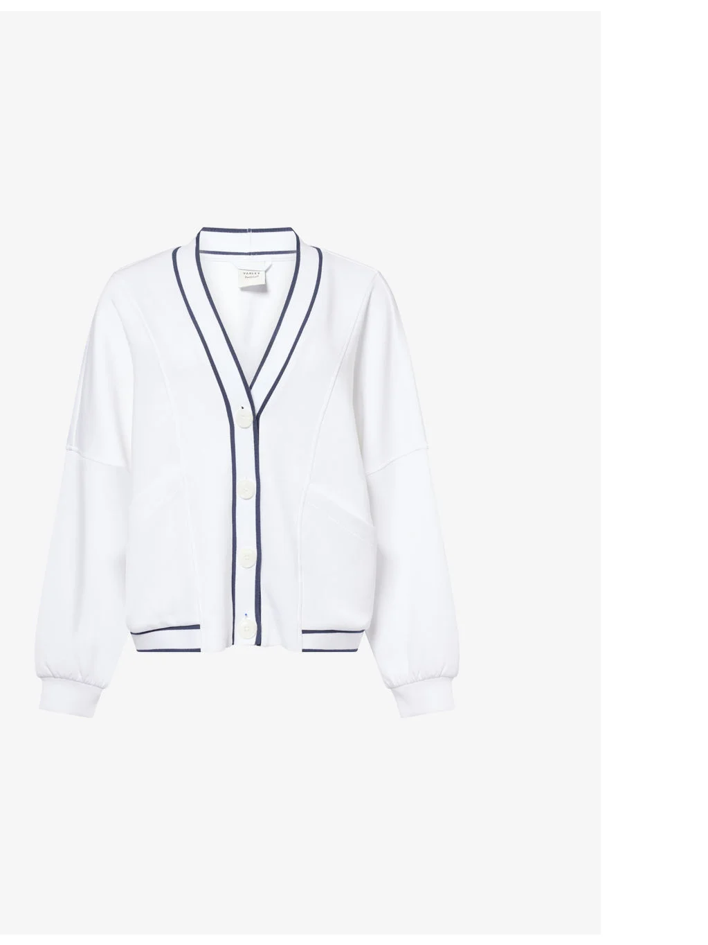 PRODUCT DETAILS - Varley stretch-jersey cardigan - 72% viscose, 23% polyester, 5% elastane; trims 100% cotton - Exposed button fastenings at front - Relaxed fit, V-neck, dropped shoulders, long sleeves, two slip pockets at front, contrast piping, ribbed trims - Machine wash cold - True to size - Model is 5ft 11in/1.80m and wears a size small - Midweight, slight stretch Ref: R04147445