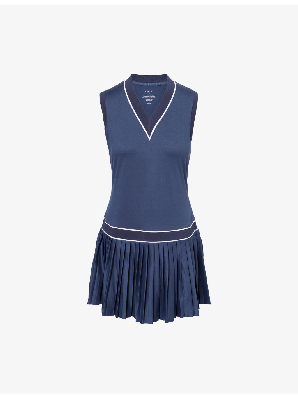 PRODUCT DETAILS - Varley woven mini dress - 88% polyester, 12% elastane - V-neck, sleeveless, contrast trims, pleated skirt, ribbed trims, mini length - Machine wash cold - True to size - Size small: length 32.5in / 82.5cm - Model is 5ft 10in/1.78m and wears a size small - Lightweight, slight stretch Ref: R04470178
