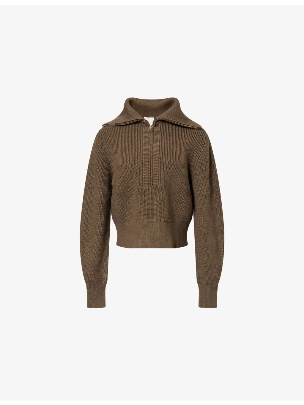 PRODUCT DETAILS - Varley knitted jumper - 42% viscose, 30% polyester, 20% nylon, 8% lyocell - Zip fastening - Regular fit, wide collar, long sleeves, ribbed knit texture - Machine wash cold - True to size - Model is 5ft 10in/1.78m and wears a size small - Midweight, stretchy Ref: R04544296