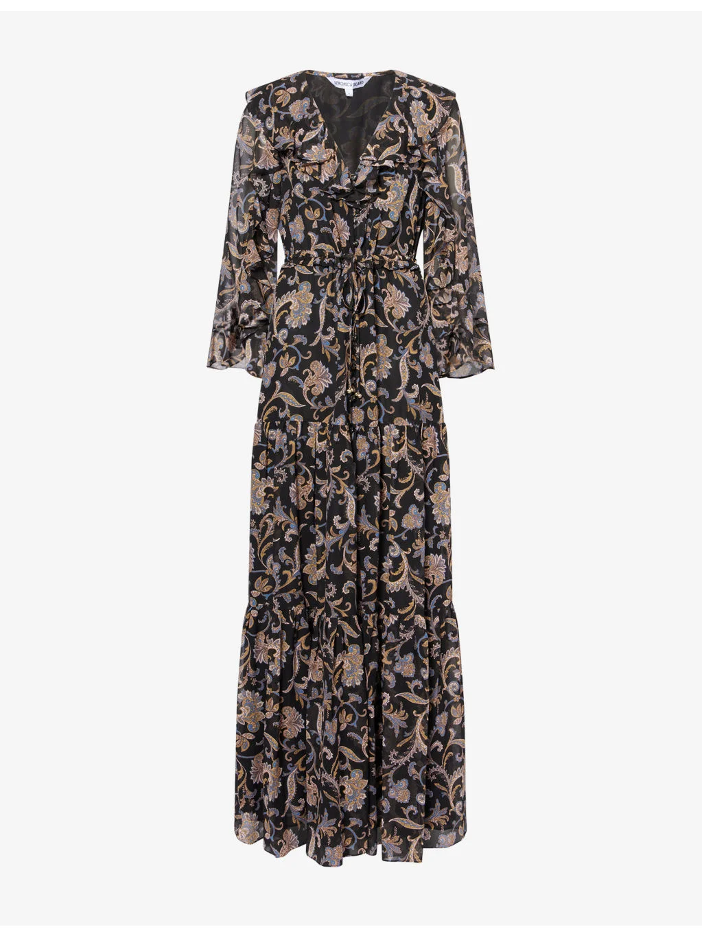 PRODUCT DETAILS - Veronica Beard silk maxi dress - 100% silk; lining 100% polyester - Button fastening - Regular fit, deep-v neck, ruffled collar, 3/4 sleeves, drawstring waistband, all-over floral print, lined - Dry clean - True to size - Size UK 8: length 64in / 162.5cm - Model is 5ft 10in/1.78m and wears a size UK 8 - Lightweight, non-stretch Ref: R04615969