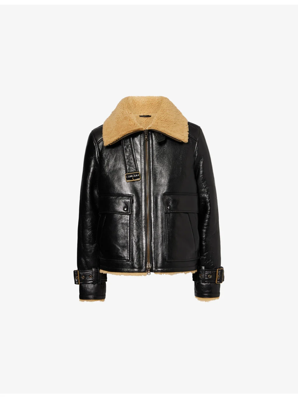 PRODUCT DETAILS - Veronica Beard shearling jacket - 100% lamb shearling - Zip fastening - Regular fit, collar, long sleeves, buckle at sleeve hems, flap pockets, contrast trims - Specialist leather clean - True to size - Model is 5ft 10in/1.78m and wears a size small - Heavyweight, non-stretch Ref: R04568239