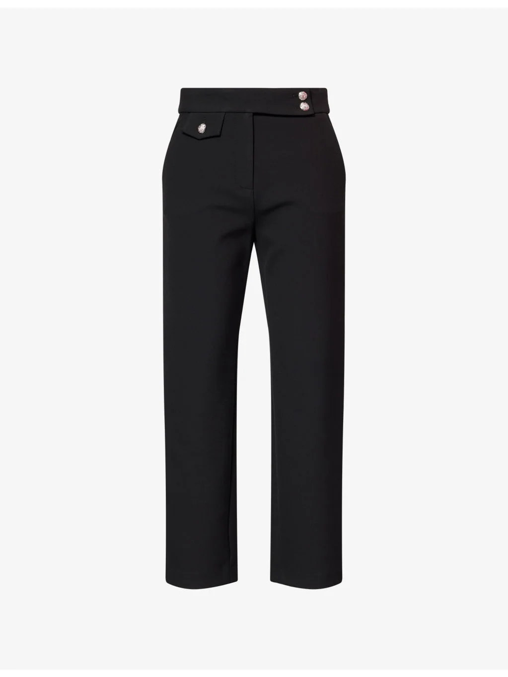 PRODUCT DETAILS - Veronica Beard woven trousers - 63% polyester, 27% viscose, 7% cotton, 3% elastane - Button and zip-fly fastenings at front - Regular fit, high-rise, tapered leg, side slip pockets, welt pockets at back - Dry clean - Made in USA - True to size - Size UK 8: rise 12in / 31cm, inside leg 27.5in / 70cm, leg opening 14in / 36cm - Model is 5ft 10in/1.78m and wears a size UK 8 - Midweight, slight stretch Ref: R04538995