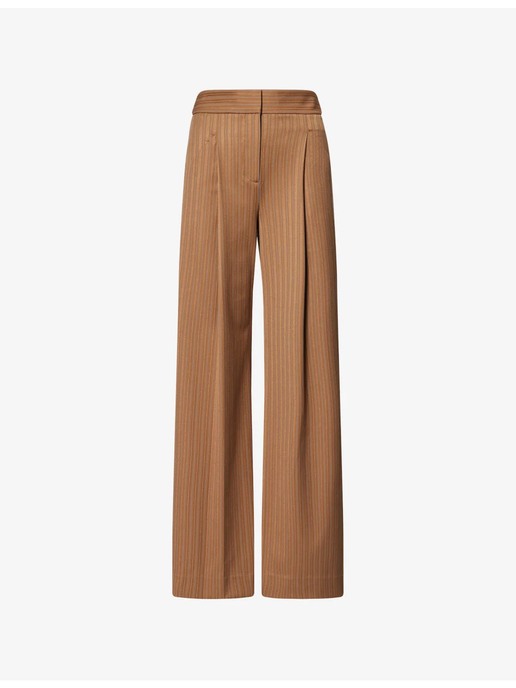 PRODUCT DETAILS - Veronica Beard stretch-woven trousers - 67% polyester, 29% viscose, 4% elastane; lining 100% polyester - Concealed button, hook-and-eye and zip-fly fastening at front - Relaxed fit, high-rise, wide leg, two slip pockets and pleated at front, two welt pockets at back, all-over striped print - Dry clean only - True to size - Size UK 8: rise 13in / 34cm, inside leg 33in / 85cm, leg opening 24in / 61cm - Model is 5ft 10in/1.78m and wears a size UK 8 - Lightweight, stretchy Ref: R04568321