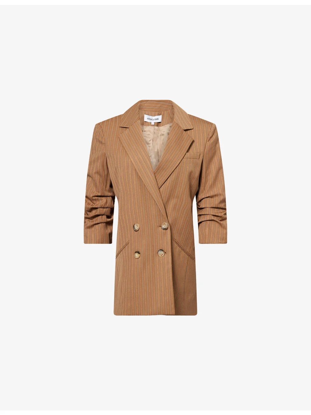 PRODUCT DETAILS - Veronica Beard stretch-woven blazer - 67% polyester, 29% viscose, 4% elastane; lining 100% cupro - Exposed button fastening at front - Regular fit, double-breasted, notch lapels, padded shoulder, ruched three-quarter sleeves, buttoned cuffs, welt pocket and two jetted pockets at front, all-over striped print, fully lined, double vent - Dry clean only - True to size - Size UK 8: length 28in / 72cm - Model is 5ft 10in/1.78m and wears a size UK 8 - Lightweight, stretchy Ref: R04568320
