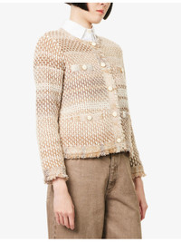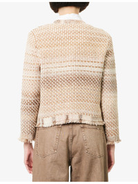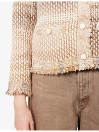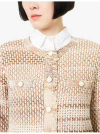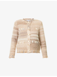 PRODUCT DETAILS - Veronica Beard cotton-blend jacket - 69% cotton, 11% wool, 11% acrylic, 9% nylon - Exposed button fastening at front - Regular fit, cropped, round-neck, padded shoulders, long sleeves, four buttoned pockets at front, all-over knitted, fringed trims - Dry clean only - True to size - Size small: length 20in / 52cm - Model is 5ft 10in/1.78m and wears a size small - Midweight, stretchy Ref: R04535632