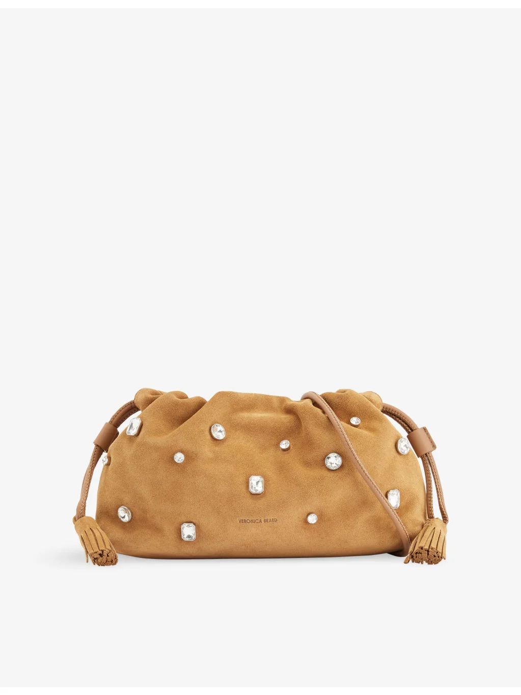 PRODUCT DETAILS - Veronica Beard suede cross-body bag - 100% suede; lining 100% polyester; trims 75% leather, 25% polyurethane - Drawstring closure - Softly structured silhouette, leather shoulder strap, silver-toned snake-chain strap, gathered cinchable top, tasselled drawstrings, one main compartment, one interior zip pocket, assorted crystal embellishments - Length 25.9cm, height 14.9cm, width 7.62cm, strap drop 58.9cm - Specialist leather clean - Made in Italy - Comes with a dust bag Ref: R04568322