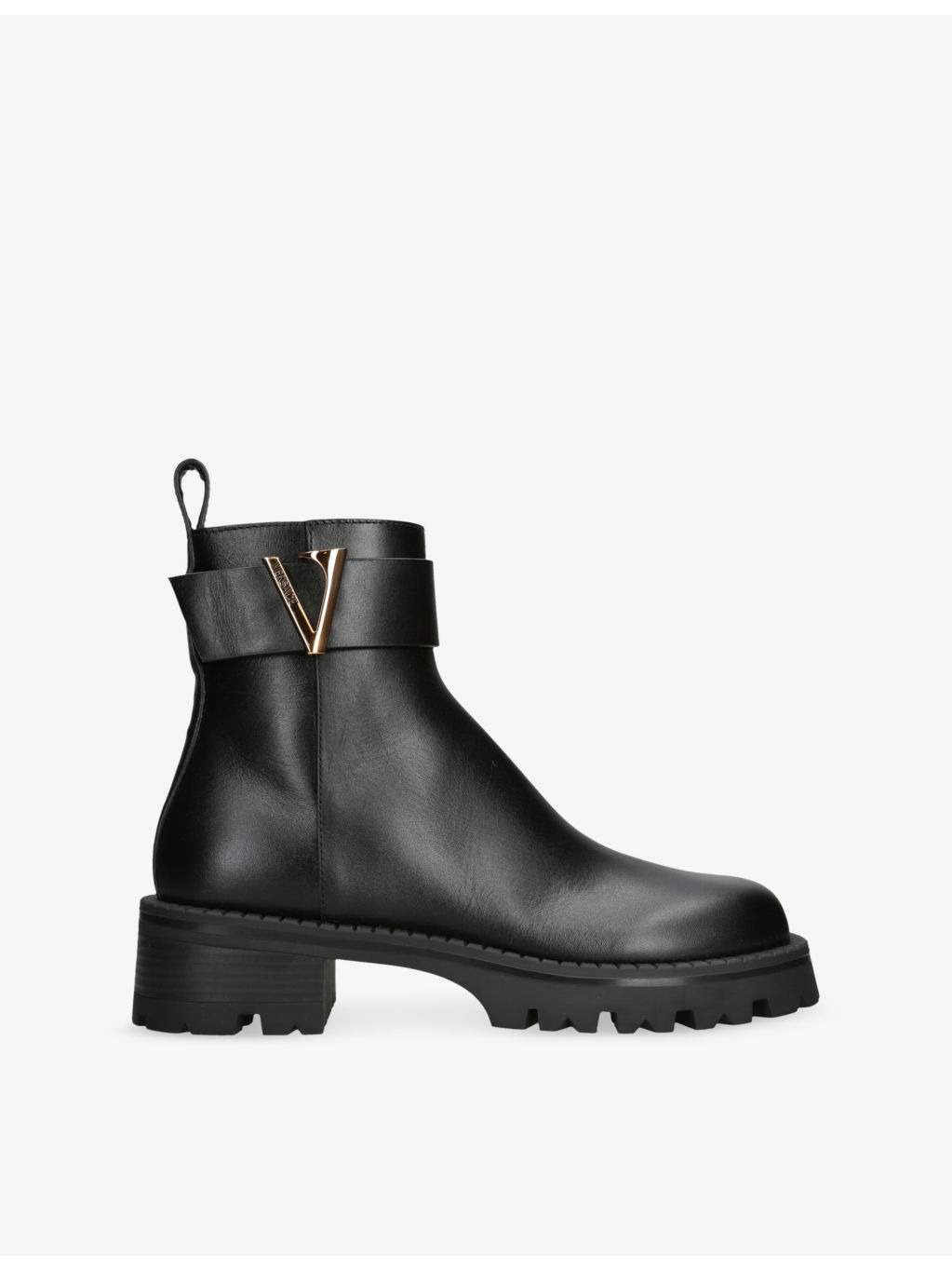 PRODUCT DETAILS - Versace leather heeled ankle boots - 100% leather - Zip fastening - Ankle rise, closed round toe, V logo strap at ankle, tread sole - Heel height 1.3in - Specialist leather clean - Upper: 100% leather - Lining: 100% leather - Sole: 100% leather Ref: R04506056