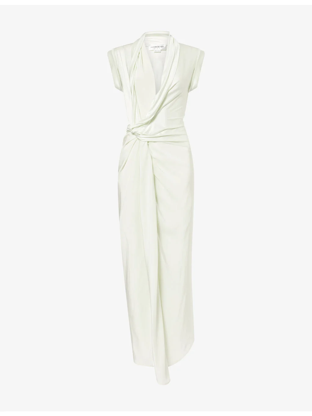 PRODUCT DETAILS - Victoria Beckham stretch-woven maxi dress - 90% viscose, 10% elastane; contrast 100% silk - Concealed zip fastening at side - Slim fit, plunge neckline, cap sleeves, folded cuffs, wrap-front, twisted panels, draped, split at side, all-over satin texture, asymmetric hem - Dry clean only - Made in Portugal - True to size - Size UK 8: length 60in / 152cm - Model is 5ft 10in/1.78m and wears a size UK 8 - Lightweight, stretchy Ref: R04553913
