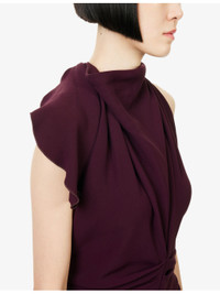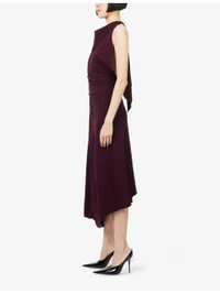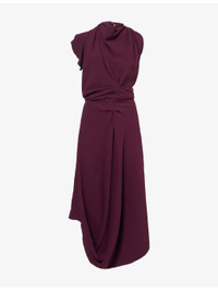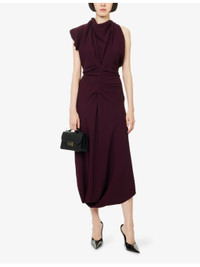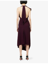 PRODUCT DETAILS - Victoria Beckham fluid-cady midi dress - 50% viscose, 47% acetate, 3% elastane - Concealed zip and hook-and-eye fastenings at back - Slim fit, halterneck with scarf trim, sleeveless, front pleat, drape detail, backless, midi length - Dry clean only - True to size - Size UK 8: length 52in / 132cm - Model is 5ft 10in/1.78m and wears a size UK 8 - Lightweight, non-stretch Ref: R04536545