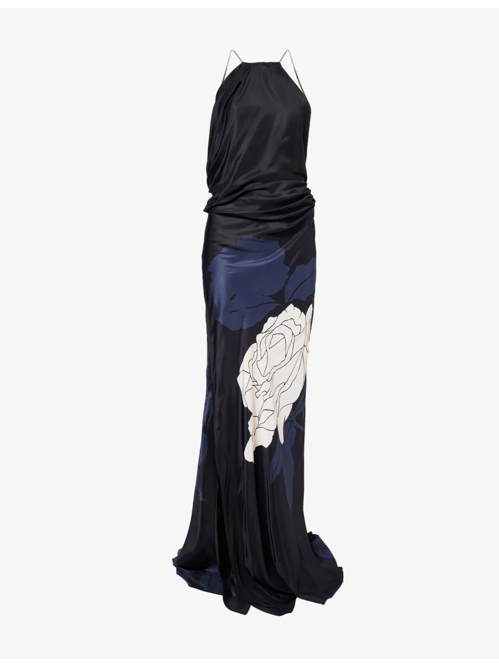 PRODUCT DETAILS - Victoria Beckham satin maxi dress - 100% viscose - Concealed zip fastening - Regular fit, round halterneck, chain spaghetti straps, low-cut back, asymmetric hem, split at side, all-over large floral print, unlined - Dry clean - Made in UK - True to size - Size UK 8: length 65in / 165cm - Model is 5ft 10in/1.78m and wears a size UK 8 - Lightweight, non-stretch Ref: R04553918