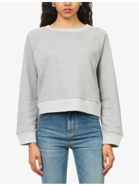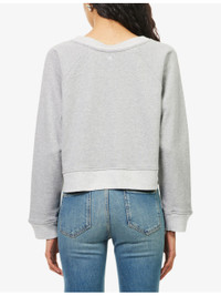 PRODUCT DETAILS - Victoria Beckham cotton-blend sweatshirt - 67% cotton, 33% modal; trims 80% modal, 20% cotton - Relaxed fit, cropped, round-neck, raglan long sleeves, monogram embroidery at back, all-over melange print, contrast ribbed trims - Machine wash at 30°C - Made in Portugal - Model is 5ft 10in/1.78m and wears a size small - Midweight, stretchy Ref: R04538498