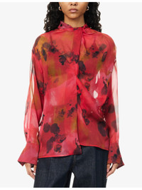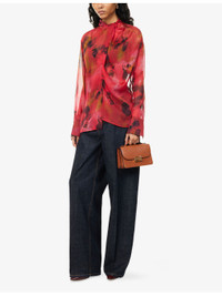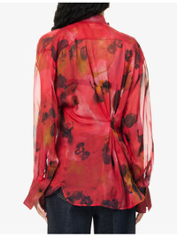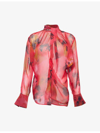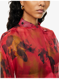 PRODUCT DETAILS - Victoria Beckham silk blouse - 100% silk; contrast 100% polyester - Exposed button fastening at front - Band collar - Buttoned cuffs - Regular fit, collar, long sleeves, draped at back, all-over abstract print, all-over satin texture, semi-sheer texture, curved hem - Dry clean only - True to size - Size UK 8: length 21in / 54cm - Model is 5ft 10in/1.78m and wears a size UK 8 - Lightweight, stretchy Ref: R04472779