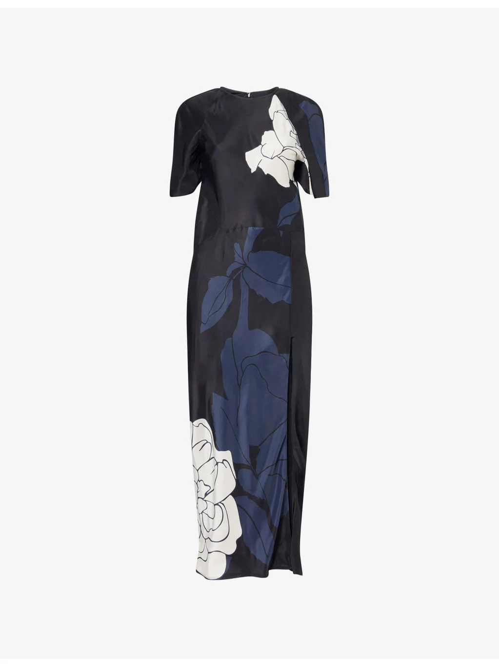 PRODUCT DETAILS - Victoria Beckham satin midi dress - 100% viscose; lining 100% polyester - Concealed zip fastening at back - Regular fit, round neck, short sleeves, buttoned placket at one sleeve, side slit at hem, all-over large floral print, lined - Dry clean - Made in Portugal - True to size - Size UK 8: length 54in /137cm - Model is 5ft 10in/1.78m and wears a size UK 8 - Lightweight, non-stretch Ref: R04553915