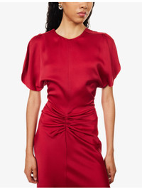 PRODUCT DETAILS - Victoria Beckham woven midi dress - 71% acetate, 29% viscose - Concealed zip fastening at back - Slim fit, round-neck, split cap sleeves, gathered at front, all-over satin texture - Dry clean - True to size - Size UK 8: length 51in / 130cm - Model is 5ft 10in/1.78m and wears a size UK 8 - Lightweight, slight stretch Ref: R04538505