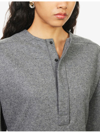 PRODUCT DETAILS - Victoria Beckham wool and cashmere top - 90% wool, 10% cashmere - Concealed button fastenings at front - Regular fit, round-neck, dropped shoulders, long sleeves, split cuffs and sides, gathered at back, cinched waist, brushed, curved hem - Dry clean only - True to size - Model is 5ft 10in/1.78m and wears a size UK 8 - Midweight, stretchy Ref: R04538517