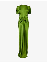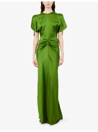 PRODUCT DETAILS - Victoria Beckham satin maxi dress - 71% acetate, 29% viscose - Concealed zip fastening at back - Regular fit, round neck, v-neck at back, short sleeves, pleated gathered waist, maxi-length, unlined - Dry clean - Made in Portugal - True to size - Size UK 8: length 63.2in / 160.5cm - Model is 5ft 10in/1.78m and wears a size UK 8 - Lightweight, non-stretch Ref: R04586918