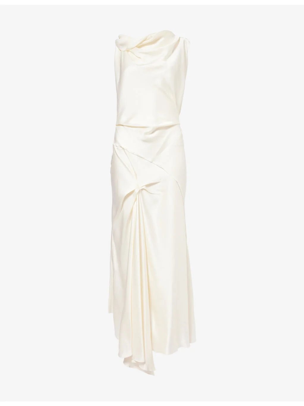 PRODUCT DETAILS - Victoria Beckham satin maxi dress - 71% acetate, 29% viscose - Concealed hook-and-eye and zip fastening at back - Regular fit, cowl neck, twisted shoulder straps, cinched waist, gathered ruching at hip, contrast stitching at front, asymmetric hemline - Dry clean - Made in Portugal - True to size - Size UK 8: length (to longest point) 62in / 158cm - Model is 5ft 9in/1.75m and wears a size UK 8 - Lightweight, non-stretch Ref: R04586919