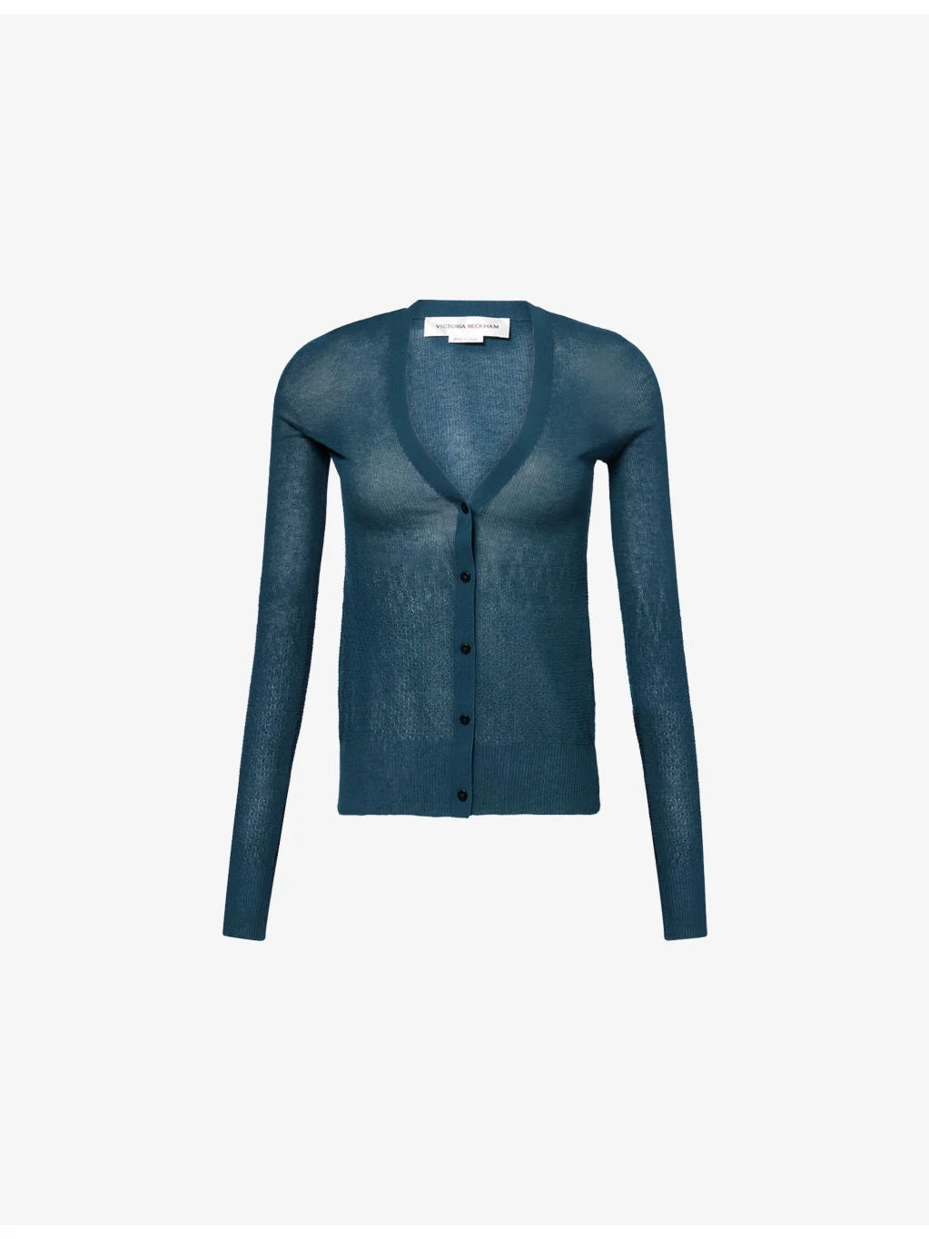 PRODUCT DETAILS - Victoria Beckham knit cardigan - 85% cotton, 15% polyamide - Button fastening at front - Regular fit, V-neck, long sleeves, ribbed trims - Dry clean - True to size - Model is 5ft 10in/1.78m and wears a size small - Lightweight, slight stretch Ref: R04553947