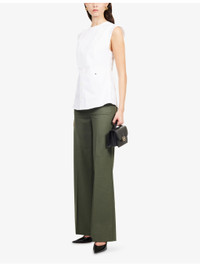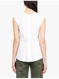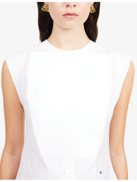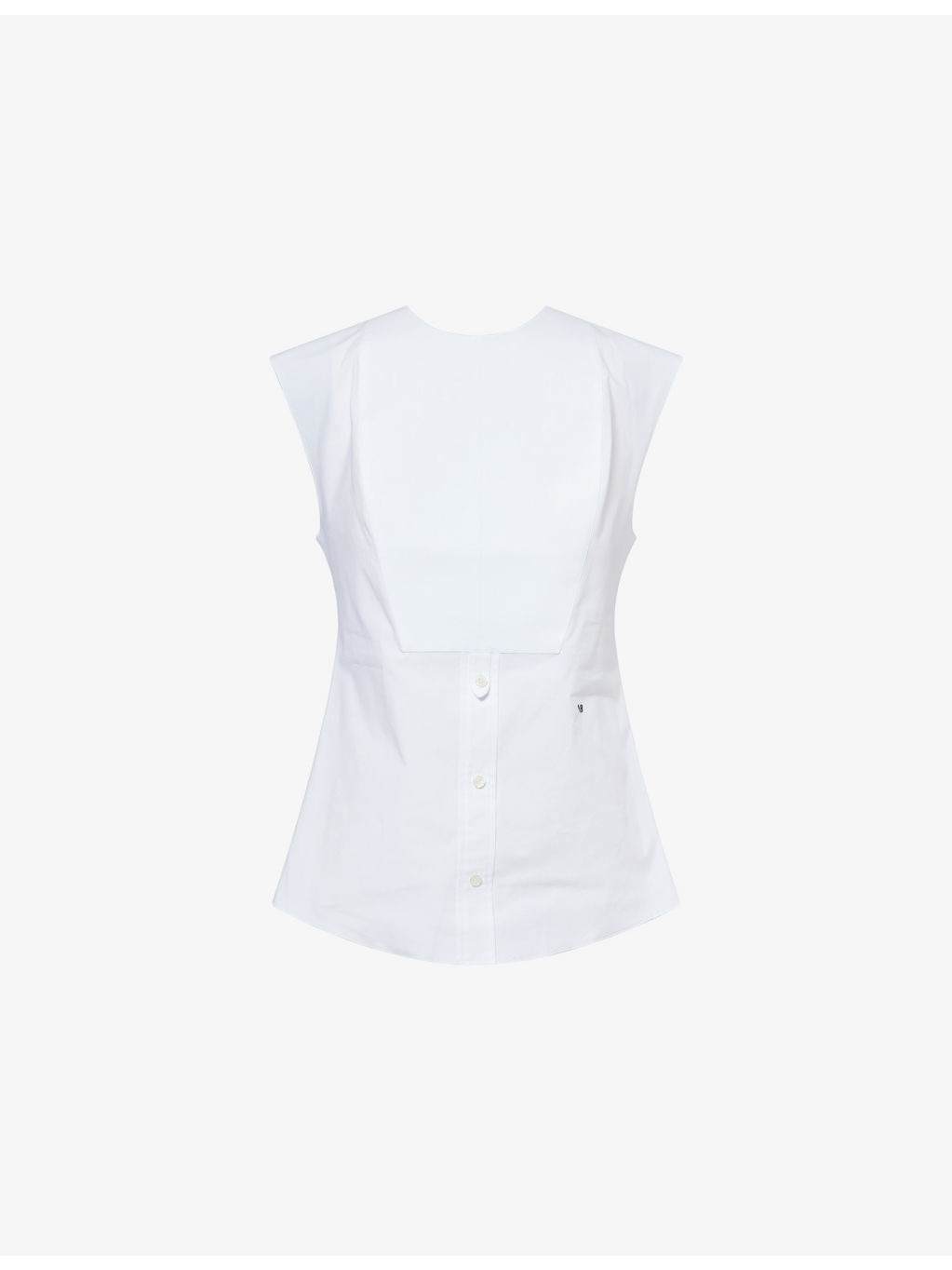 PRODUCT DETAILS - Victoria Beckham cotton shirt - 100% cotton - Button fastening - Fitted, classic collar, sleeveless, flared hem, bib detail and logo at back - Dry clean - Size 8: length 26in / 66cm - Model is 5ft 10in/1.78m and wears a size UK 8 - Lightweight, non-stretch - Made in Italy Ref: R04512623