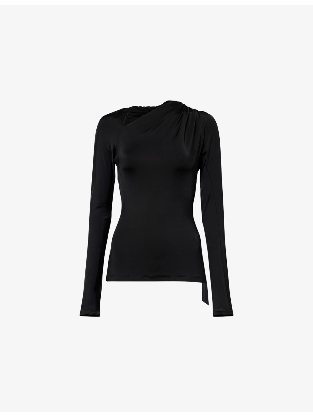 PRODUCT DETAILS - Victoria Beckham stretch-woven top - 54% polyester, 44% virgin wool, 2% elastane - Relaxed fit, draped neckline, long sleeves, twisted panels and out-out at back, hanging panel at back - Dry clean - Made in Portugal - True to size - Model is 5ft 10in/1.78m and wears a size UK 8 - Lightweight, stretchy Ref: R04472780