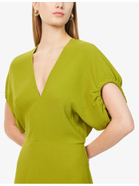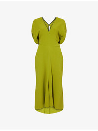 PRODUCT DETAILS - Victoria Beckham stretch-woven midi dress - 50% viscose, 47% acetate, 3% elastane - Concealed zip fastening at back - Regular fit, V neck, wide short sleeves, all-over crepe texture, asymmetric hem - Dry clean - Made in Portugal - True to size - Size UK 8: length 55in / 140cm - Model is 5ft 10in/1.78m and wears a size UK 8 - Lightweight, stretchy Ref: R04446116