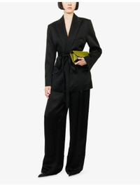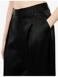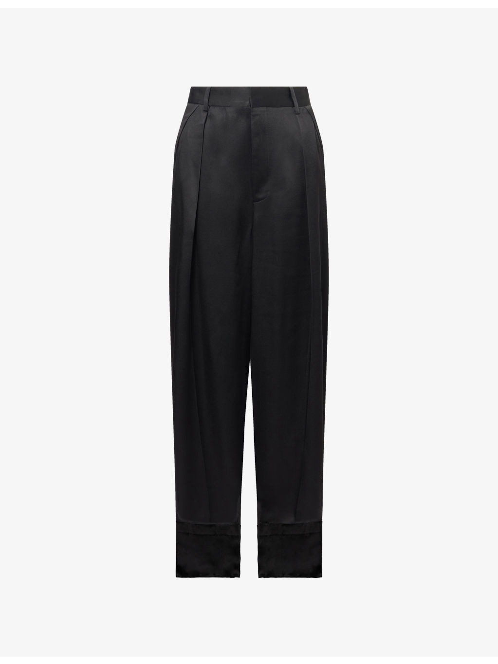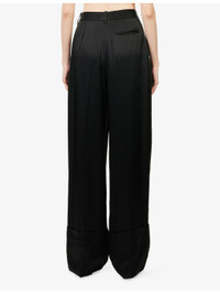 PRODUCT DETAILS - Victoria Beckham crepe trousers - 71% acetate, 29% viscose; lining 100% viscose - Concealed button, hook-and-eye and zip-fly fastening at front - Relaxed fit, high-rise, wide leg, structured waistband with belt loops, front pleats, two side overflap pockets, one rear jetted pocket, deep turned-up hems, fluid crepe back satin texture - Dry clean only - Made in UK - True to size - Size UK 8: rise 14in / 35.5cm, inside leg 33in / 84cm, leg opening 22in / 56cm - Model is 5ft 10in/1.78m and wears a size UK 8 - Lightweight, non-stretch Ref: R04536557
