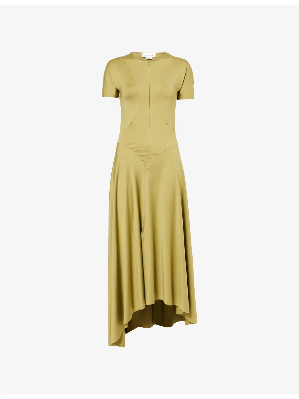 PRODUCT DETAILS - Victoria Beckham stretch-jersey midi dress - 90% polyester, 10% elastane - Concealed half-zip fastening at front - Slim fit, round neck, short sleeves, asymmetric hem, panelling, midi length - Dry clean only - Made in Portugal - True to size - Size UK 8: length 46in / 117cm - Model is 5ft 10in/1.78m and wears a size UK 8 - Lightweight, slight stretch Ref: R04553919