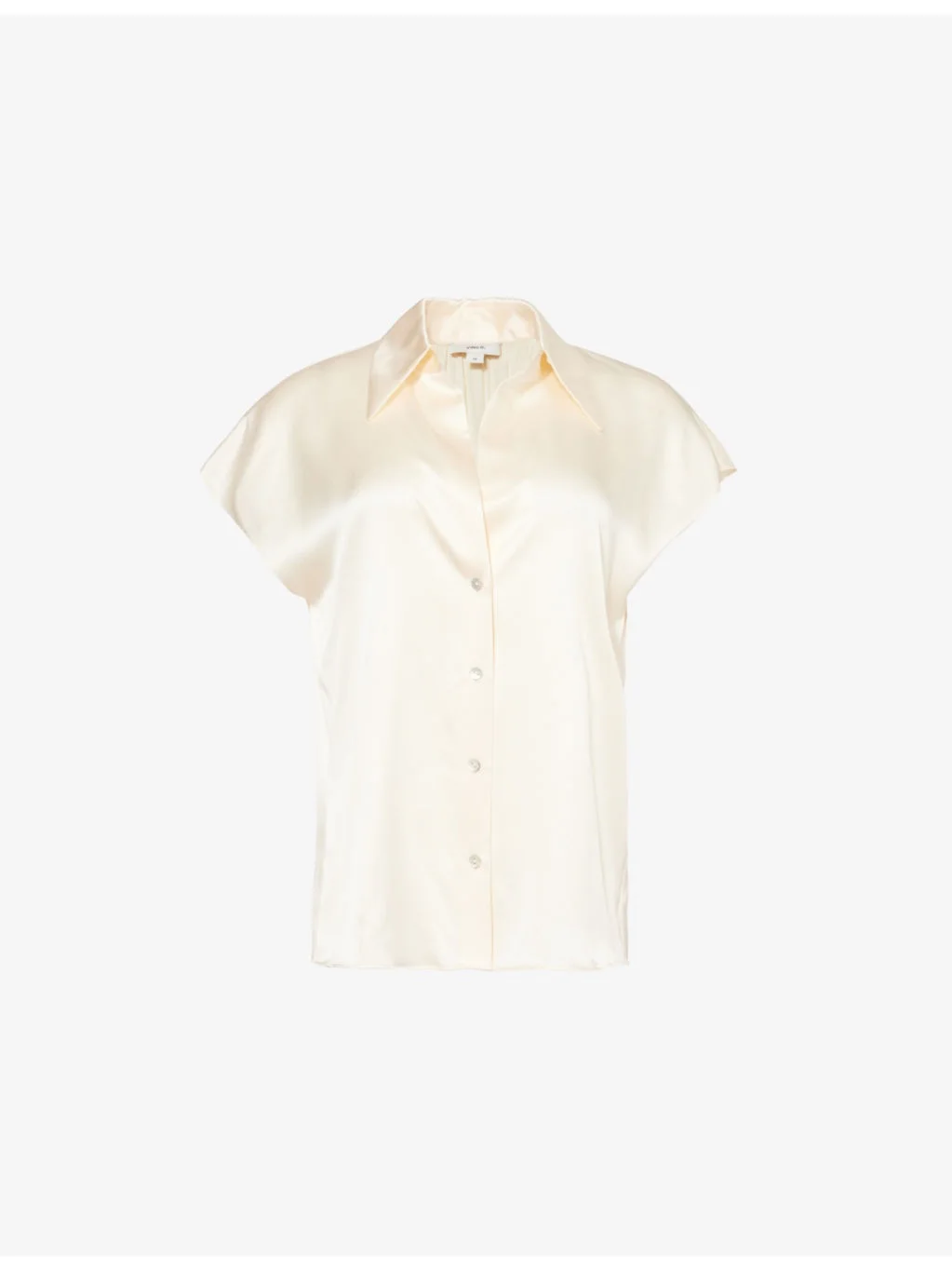 PRODUCT DETAILS - Vince silk shirt - 100% silk - Exposed button fastenings at front - Regular fit, pointed collar, sleeveless, semi-sheer - Hand wash cold - True to size - Size small: length 24.5 in / 63 cm - Model is 5 ft 10 in/1.78 m and wears a size small - Lightweight, non-stretch