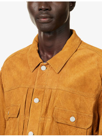 PRODUCT DETAILS - visvim suede jacket - 100% leather; lining 100% rayon - Button fastening - Regular fit, classic collar, long sleeves, buttoned cuffs, two flap pockets at front, two zipped pockets at sides, pleated placket, dyed leather patch at back, unlined - Specialist leather clean - Made in Japan - True to size - Size small: chest 44in / 111.6cm, length 30in / 62.2cm - Model is 6ft 2in/1.88m and wears a size small - Midweight, non-stretch Ref: R04444011