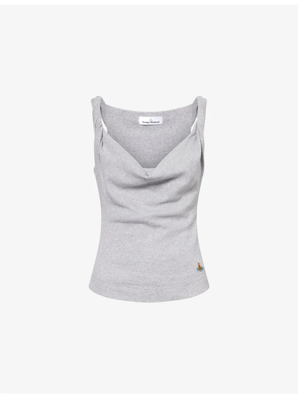PRODUCT DETAILS - Vivienne Westwood stretch-cotton top - 95% cotton, 5% elastane - Slim fit, draped neckline, twisted shoulder straps, orb embroidery at front, all-over ribbed, partially lined - Machine wash at 30°C - Made in Tunisia - True to size - Model is 5ft 10in/1.78m and wears a size small - Midweight, stretchy Ref: R04561982