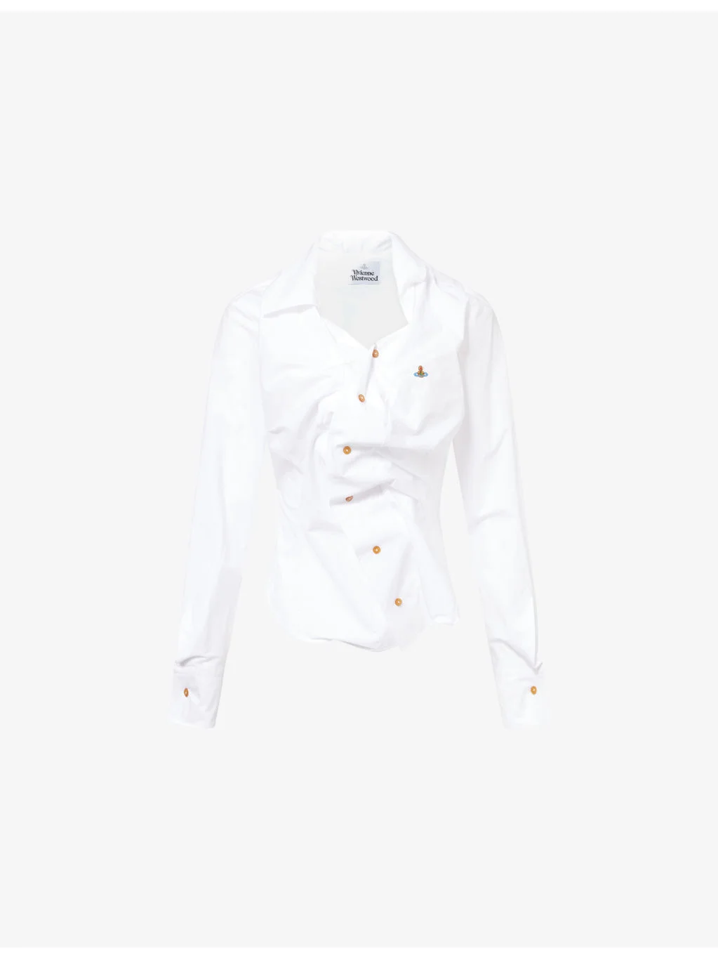 PRODUCT DETAILS - Vivienne Westwood cotton-poplin shirt - 100% cotton - Exposed button fastenings at front - Regular fit, pointed collar, long sleeves, buttoned cuffs, Orb embroidery at chest, darting at front, cinched-in waist, off-centre button placket, contorted seams, asymmetrical hem - Machine wash at 30°C - Made in Italy - Size UK 10: length 24.5in / 62cm - Model is 5ft 10in / 1.78m and wears a size UK 10 - Lightweight, non-stretch Ref: R04561988
