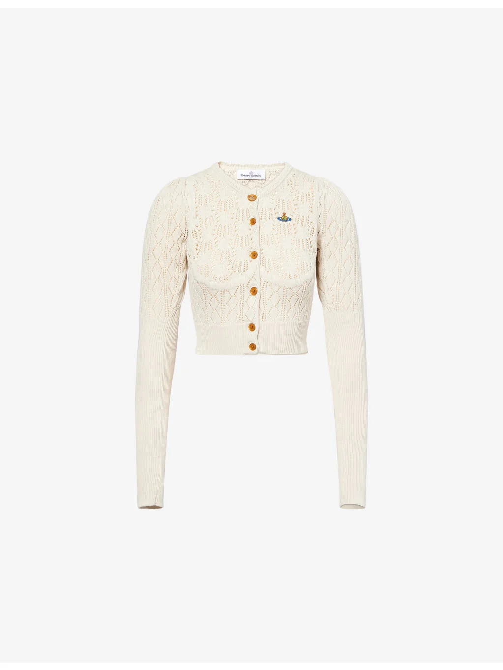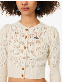 PRODUCT DETAILS - Vivienne Westwood cotton cardigan - 100% cotton - Exposed button fastenings at front - Slim fit, V-neck, long gathered sleeves, ribbed trims, Orb logo embroidered at chest, all-over frost flower and geometric lace stitches, scalloped edges - Hand wash - Made in Italy - True to size - Model is 5ft 10in/1.78m and wears a size small - Midweight, slight stretch Ref: R04600197