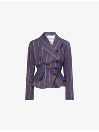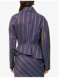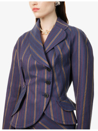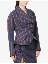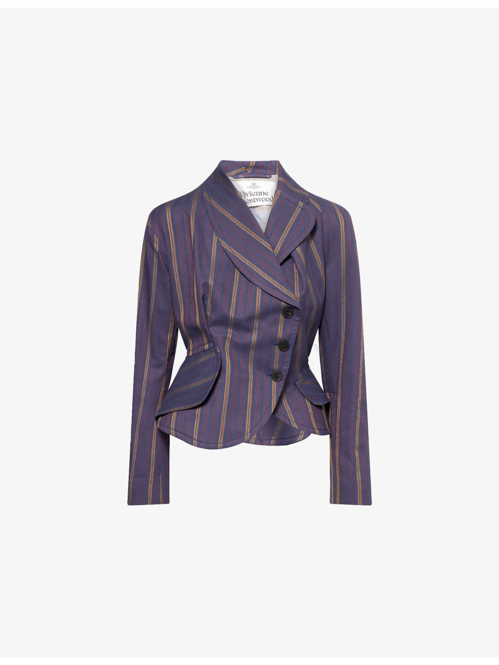PRODUCT DETAILS - Vivienne Westwood cotton-blend jacket - 96% cotton, 4% polyester - Button fastening - Regular fit, single breasted, asymmetric lapels, long sleeves, flap pockets at front, stripe pattern, lined - Dry clean - True to size - Size UK 8: length 24in / 61cm - Model is 5ft 10in/1.78m and wears a size UK 8 - Midweight, non-stretch Ref: R04466592