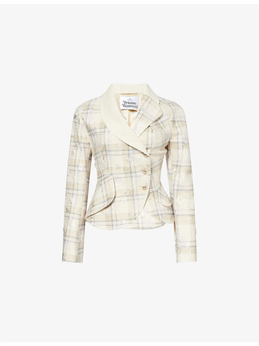 PRODUCT DETAILS - Vivienne Westwood cotton-blend jacket - 81% cotton, 18% viscose, 1% elastane; lining 100% viscose - Button fastening - Regular fit, notched lapels, long sleeves, flap peplum waist, slip pockets at front, all-over checked print and distressed patches, fully lined - Dry clean - Made in Italy - True to size - Size UK 8: length 23in / 58.5cm - Model is 5ft 10in/1.78m and wears a size UK 8 - Midweight, non-stretch Ref: R04600194