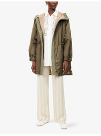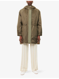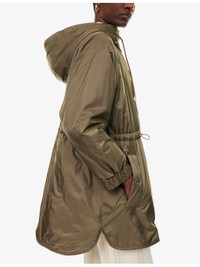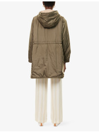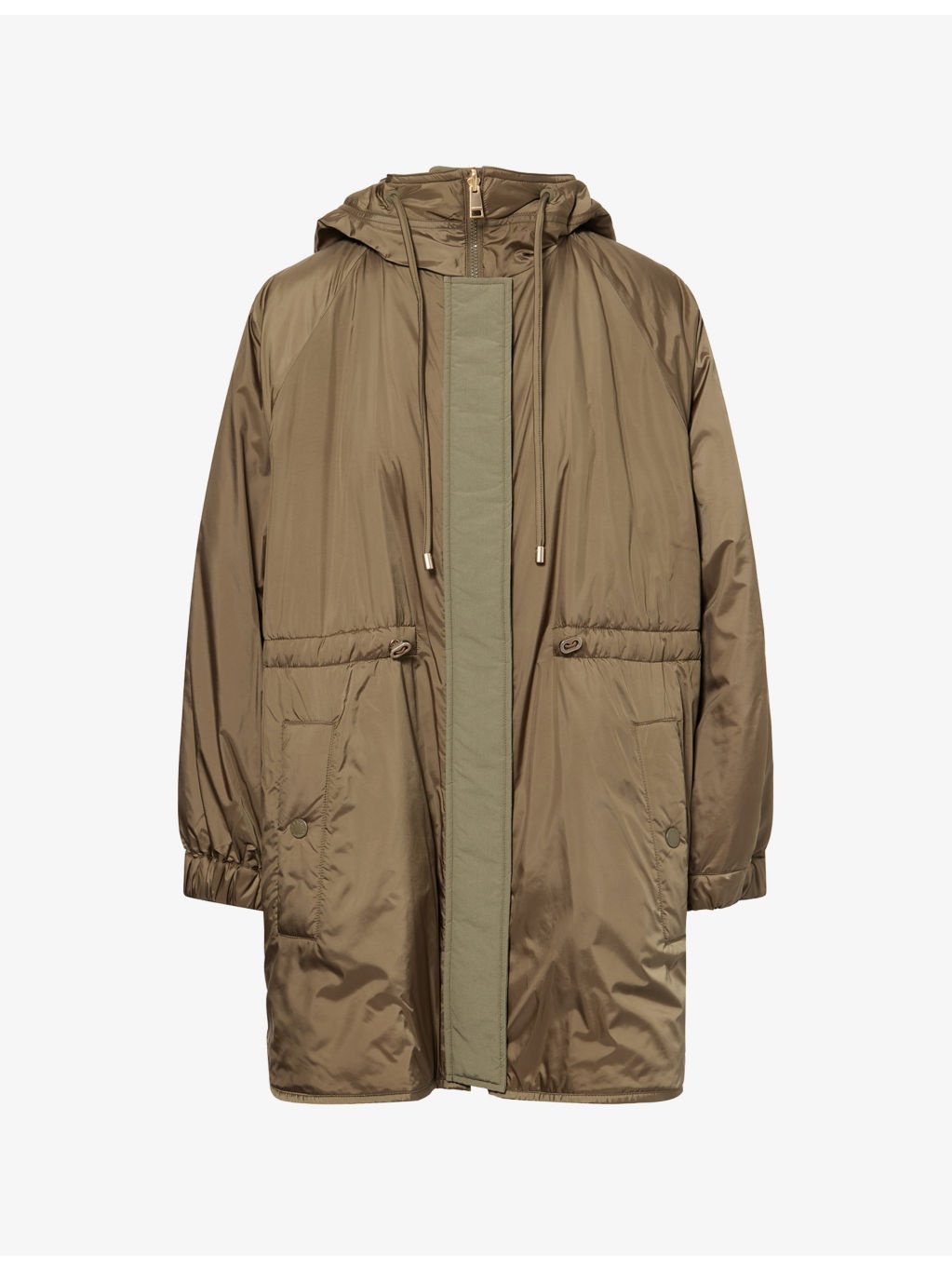 PRODUCT DETAILS - Weekend Max Mara shell coat - 100% polyester; filling 49% polyester, 46% camel wool, 5% silk; lining 100% polyamide - Concealed popper and zip fastening at front - Relaxed fit, high-neck, drawstring hood, raglan long sleeves, buttoned elasticated cuffs, two buttoned pockets and contrast panel at front, drawstring waistband, all-over padded, fully lined - Dry clean only - True to size - Size UK 8: length 34in / 87cm - Model is 5ft 10in/1.78m and wears a size UK 8 - Midweight, non-stretch Ref: R04478764
