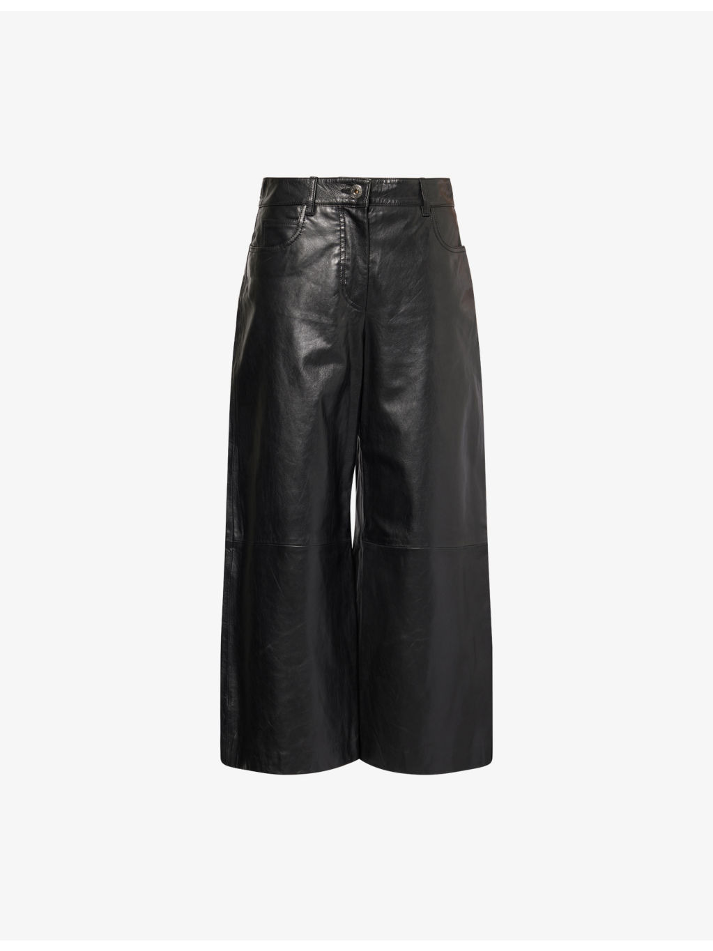 PRODUCT DETAILS - Weekend Max Mara leather trousers - 100% leather - Button and zip-fly fastenings at front - Relaxed fit, mid-rise, wide leg, belt loops, five pockets, cropped length - Specialist leather clean - True to size - Size UK 8: rise 12in / 32cm, inside leg 25in / 64cm, leg opening 25in / 64cm - Model is 5ft 10in/1.78m and wears a size UK 8 - Midweight, non-stretch Ref: R04504417
