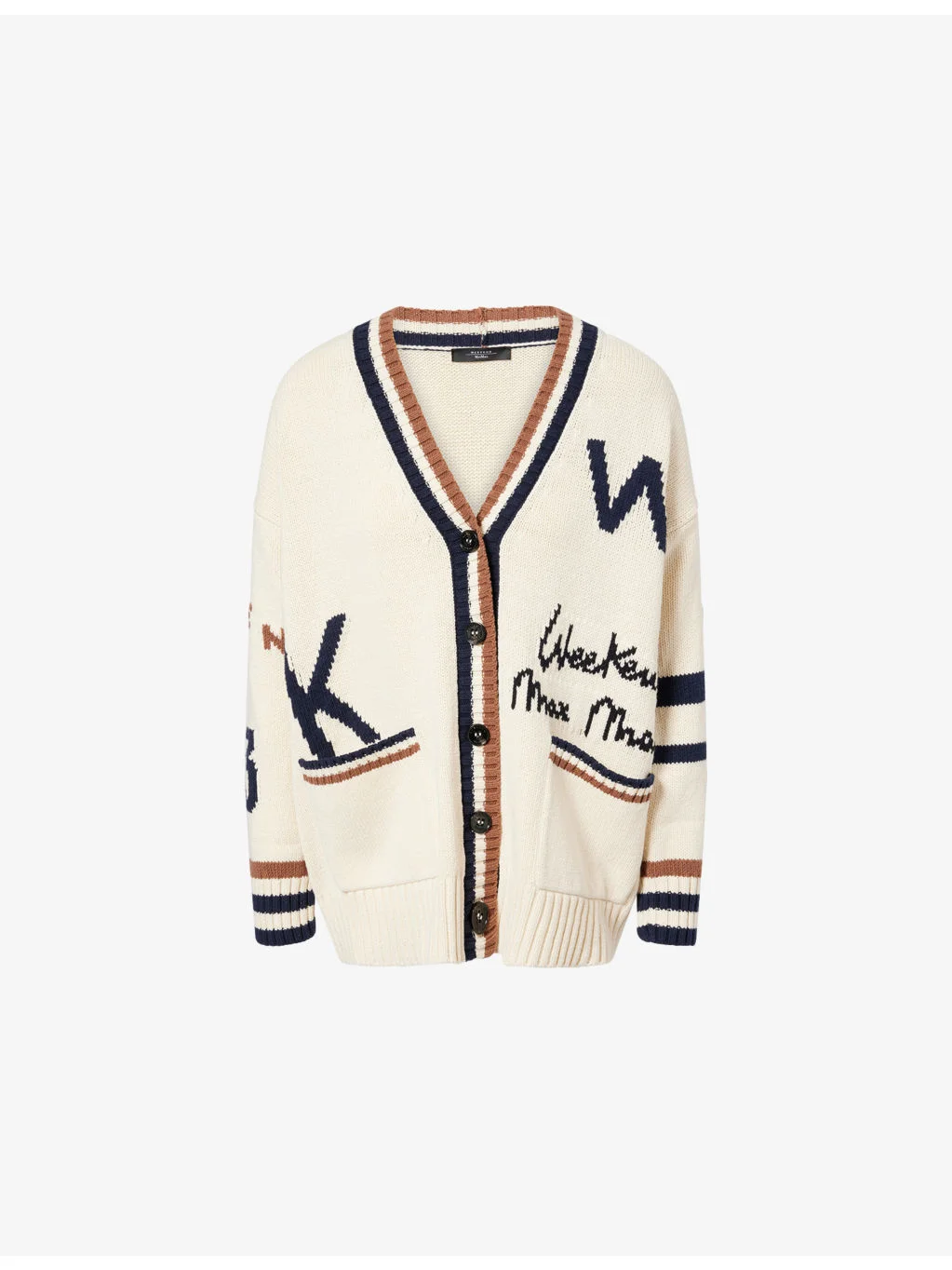 PRODUCT DETAILS - Weekend Max Mara cotton-blend cardigan - 60% cotton, 40% acrylic - Exposed button fastening at front - Relaxed fit, V-neck, long sleeves, brand print and two patch pockets at front, all-over knitted, striped ribbed trims - Hand wash cold - True to size - Size small: length 25in / 64cm - Model is 5ft 10in/1.78m and wears a size small - Midweight, stretchy Ref: R04552959