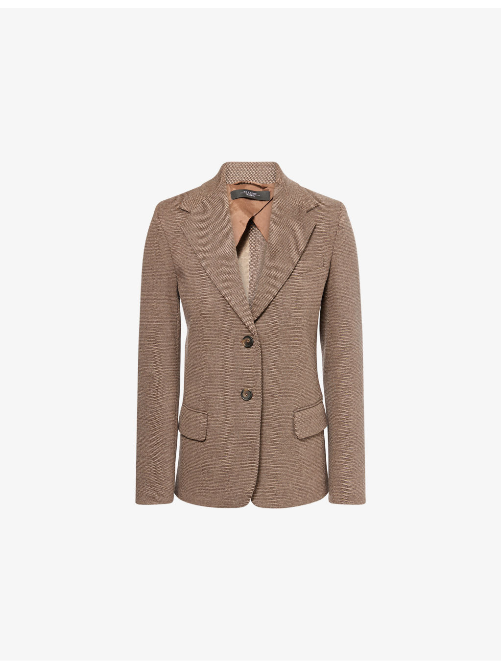 PRODUCT DETAILS - Weekend Max Mara stretch-woven blazer - 35% polyester, 23% wool, 23% cotton, 17% viscose, 2% elastane; lining 95% polyester, 5% elastane - Exposed button fastening at front - Regular fit, single-breasted, notch lapels, padded shoulders, long sleeves, welt pocket and two flap pockets at front, fully lined - Dry clean - True to size - Size small: length 25in / 64cm - Model is 5ft 10in/1.78m and wears a size small - Midweight, stretchy Ref: R04504430