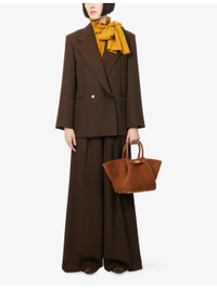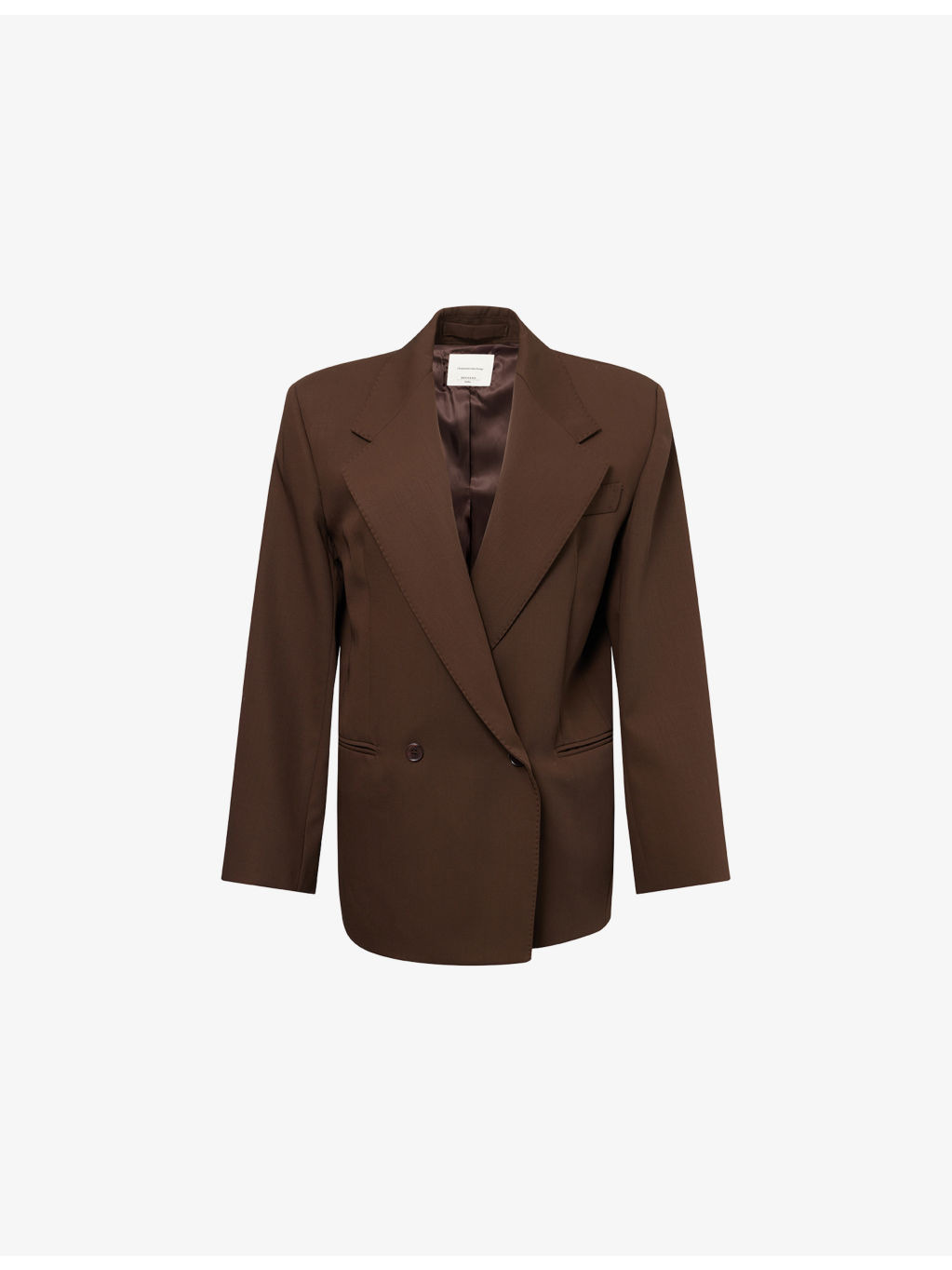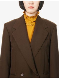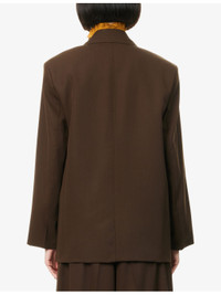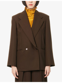 PRODUCT DETAILS - Weekend Max Mara wool blazer - 100% virgin wool; lining 50% acetate, 50% viscose; sleevelining 53% acetate, 47% viscose - Exposed button fastening at front - Relaxed fit, double-breasted, notch lapels, padded shoulders, long sleeves, welt pocket and two jetted pockets at front, fully lined - Dry clean - True to size - Size UK 8: length 27in / 70cm - Model is 5ft 10in/1.78m and wears a size UK 8 - Lightweight, stretchy Ref: R04504433