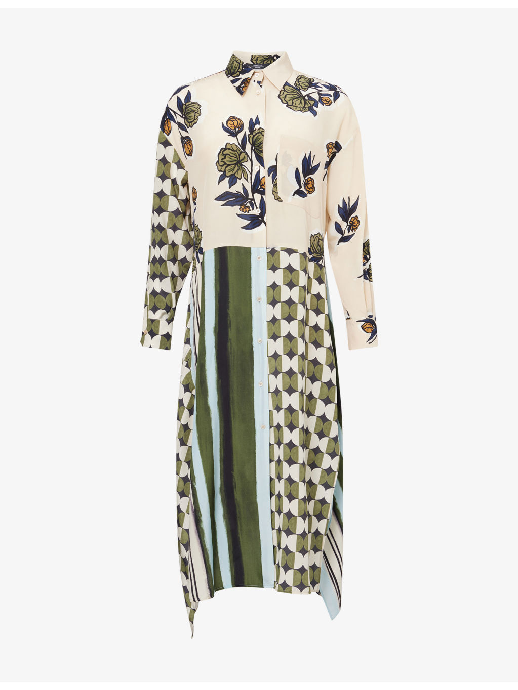 PRODUCT DETAILS - Weekend Max Mara silk midi dress - 100% silk - Exposed button fastening at front - Relaxed fit, H-line silhouette, spread collar, long sleeves, buttoned cuffs, patch pocket at front, darts at back, split at sides, all-over floral and geometric print, all-over satin texture - Hand wash cold - True to size - Size UK 8: length 46in / 117cm - Model is 5ft 10in/1.78m and wears a size UK 8 - Lightweight, stretchy Ref: R04504407