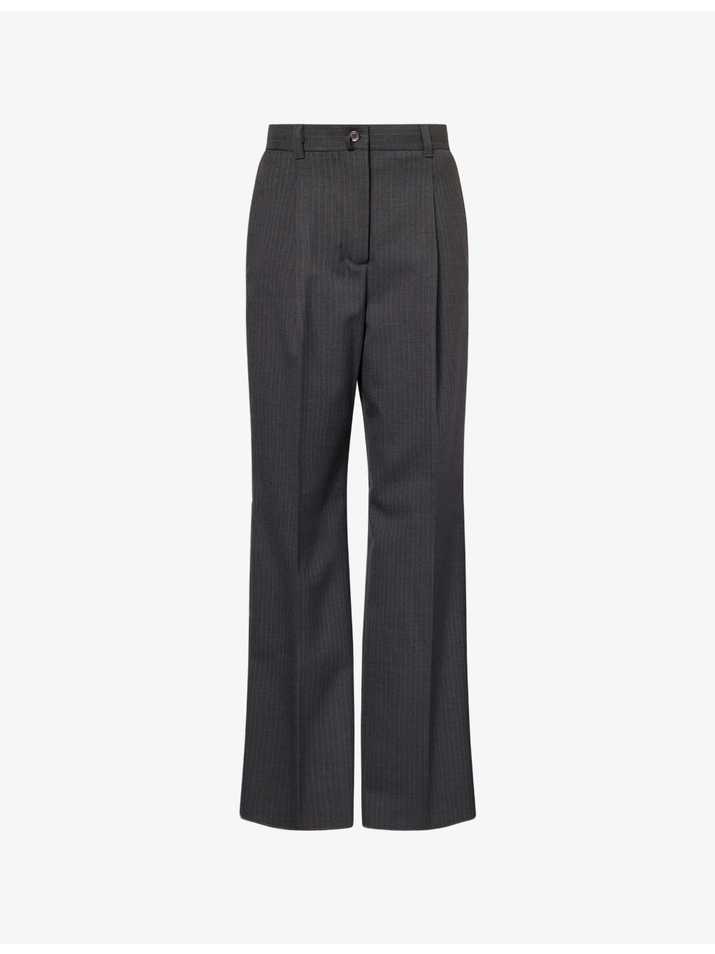 PRODUCT DETAILS - Weekend Max Mara wool trousers - 100% wool - Button and zip-fly fastenings at front - Regular fit, high-rise, wide leg, belt loops, front pleats, side slip pockets, all-over pinstripe pattern - Dry clean - True to size - Size UK 8: rise 12.5in / 32cm, inside leg 33.5in / 85cm, leg opening 19in / 48cm - Model is 5ft 10in/1.78m and wears a size UK 8 - Midweight, non-stretch Ref: R04504439