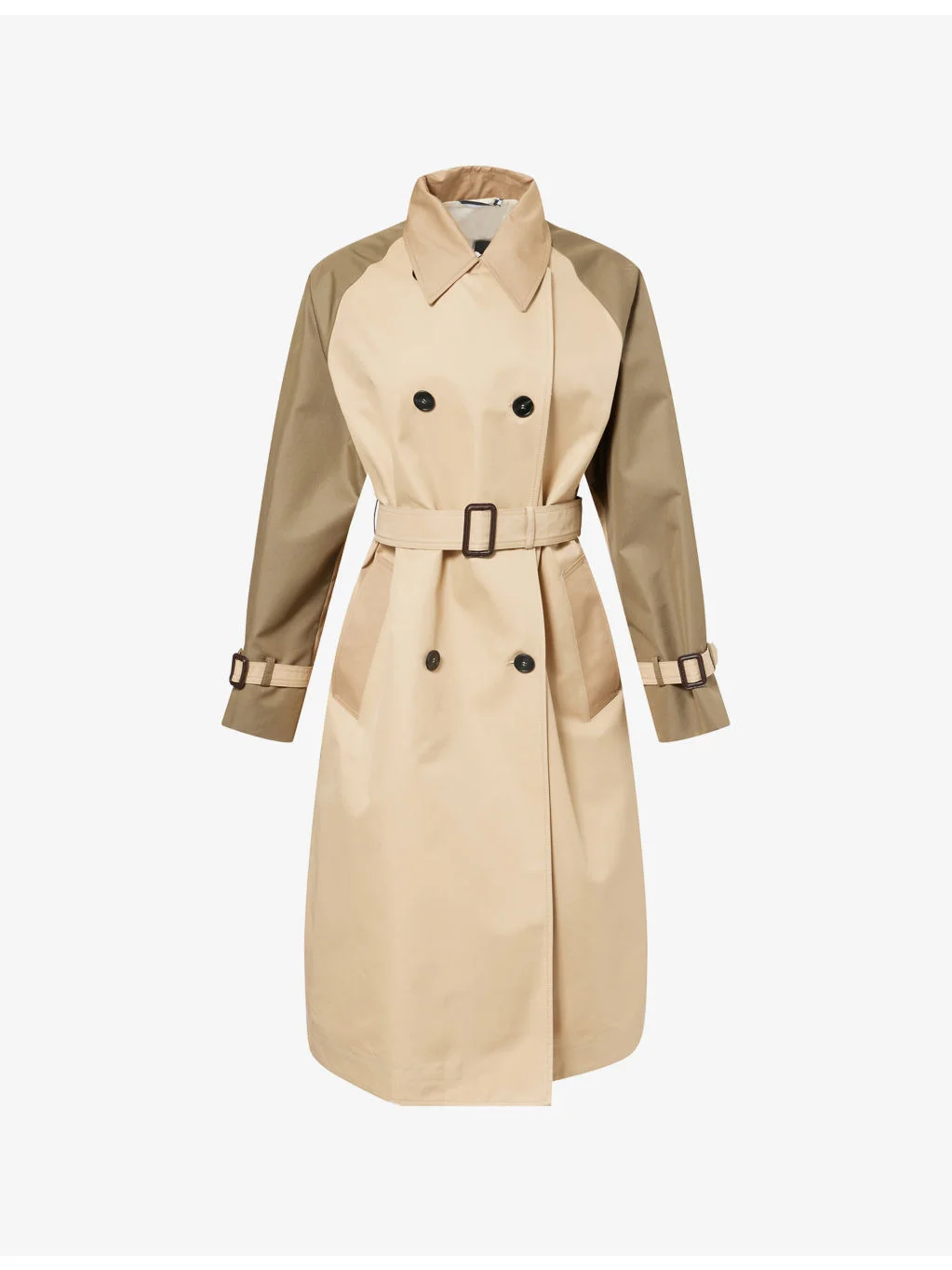 PRODUCT DETAILS - Weekend Max Mara cotton-garbadine trench coat - 65% cotton, 35% polyester; lining 100% cotton; sleevelining 50% viscose, 50% polyester - Exposed button fastenings at front - Regular fit, double-breasted, two-in-one shirt collar, long sleeves, adjustable cuff tabs, adjustable buckle belt, rain cape, two side pockets, central rear vent, reversible design, water-repellent, partial lining - Specialist dry clean only - True to size - Size UK 8: length 45in / 115cm - Model is 5ft 10in/1.78m and wears a size UK 8 - Midweight, non-stretch Ref: R04552929