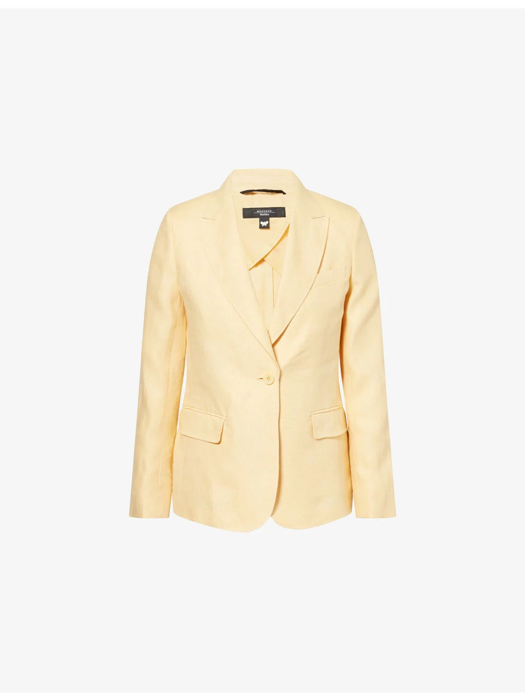 PRODUCT DETAILS - Weekend Max Mara linen blazer - 100% linen - Button fastening - Regular fit, single-breasted, peak lapels, padded shoulders, long sleeves, buttoned cuffs, flap pockets at front, open vent at back - Dry clean only - True to size - Size UK 8: length 26in / 66cm - Model is 5ft 10in/1.78m and wears a size UK 8 - Lightweight, non-stretch Ref: R04585241