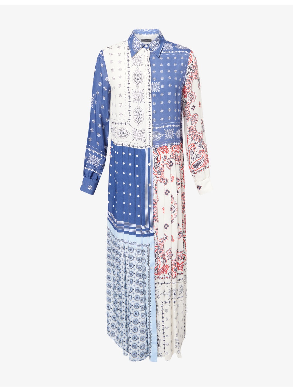 PRODUCT DETAILS - Weekend Max Mara woven midi dress - 100% viscose - Exposed button fastening at front - Relaxed fit, H-line silhouette, spread collar, long sleeves, buttoned cuffs, two slip pockets at front, pleated skirt, all-over pleated, all-over satin texture - Dry clean - True to size - Size UK 8: length 51in / 130cm - Model is 5ft 10in/1.78m and wears a size UK 8 - Lightweight, slight stretch Ref: R04478757