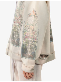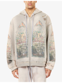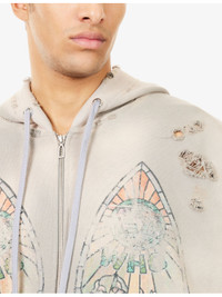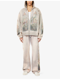 PRODUCT DETAILS - WHO DECIDES WAR BY EV BRAVADO cotton hoddy - 100% cotton - Exposed zip fastening at front - Drawstring fixed hood, long sleeves, two patch pockets at front, all-over graphic print design, faded wash, distressed detailing - Machine wash mild - Made in Turkey - Model is 6ft 2in/1.88m and wears a size medium - Lightweight, non-stretch Ref: R04556677