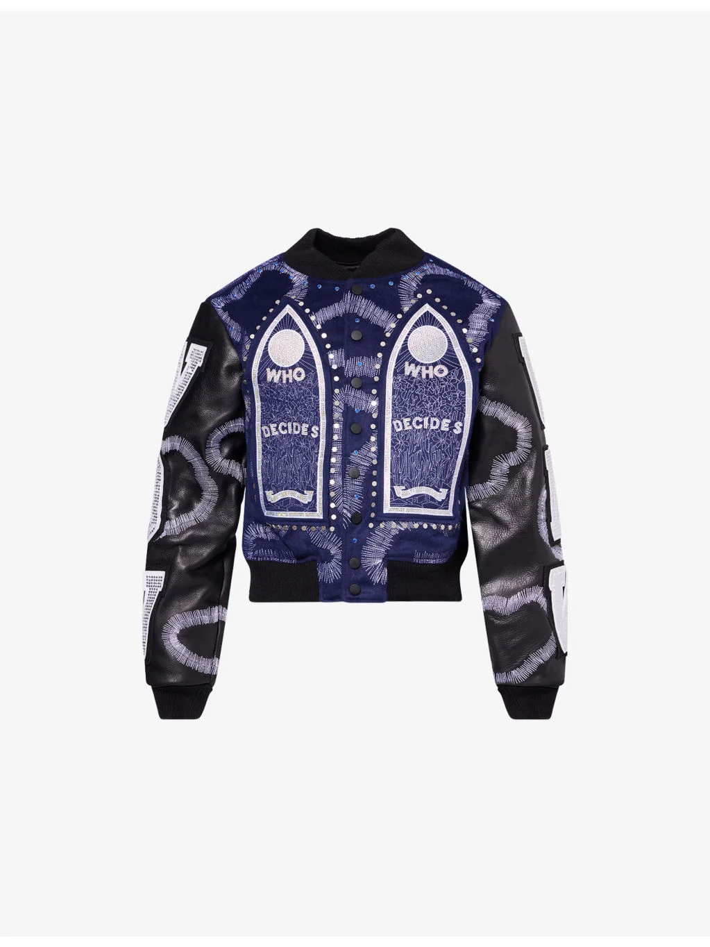 PRODUCT DETAILS - WHO DECIDES WAR BY EV BRAVADO woven jacket - 100% polyester - Pressed stud fastening at front - Crewneck, faux-leather long sleeves, two welt pockets at front, all-over embellished and embroidered detailing, ribbed trims - Machine wash mild - Size medium: length 24.8in / 63cm, chest 43.3in / 110cm - Model is 6ft 2in/1.88m and wears a size medium - Midweight, non-stretch Ref: R04556676